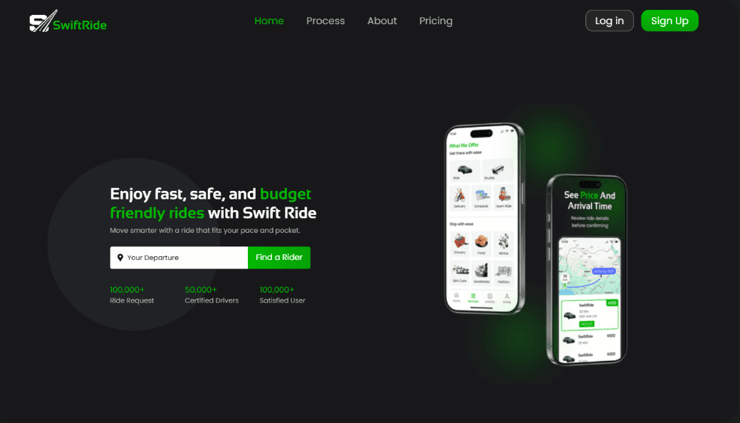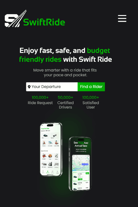 A modern ride-hailing app designed with a sleek, intuitive interface. It focuses on seamless booking, real-time tracking, and a smooth user experience across all devices.