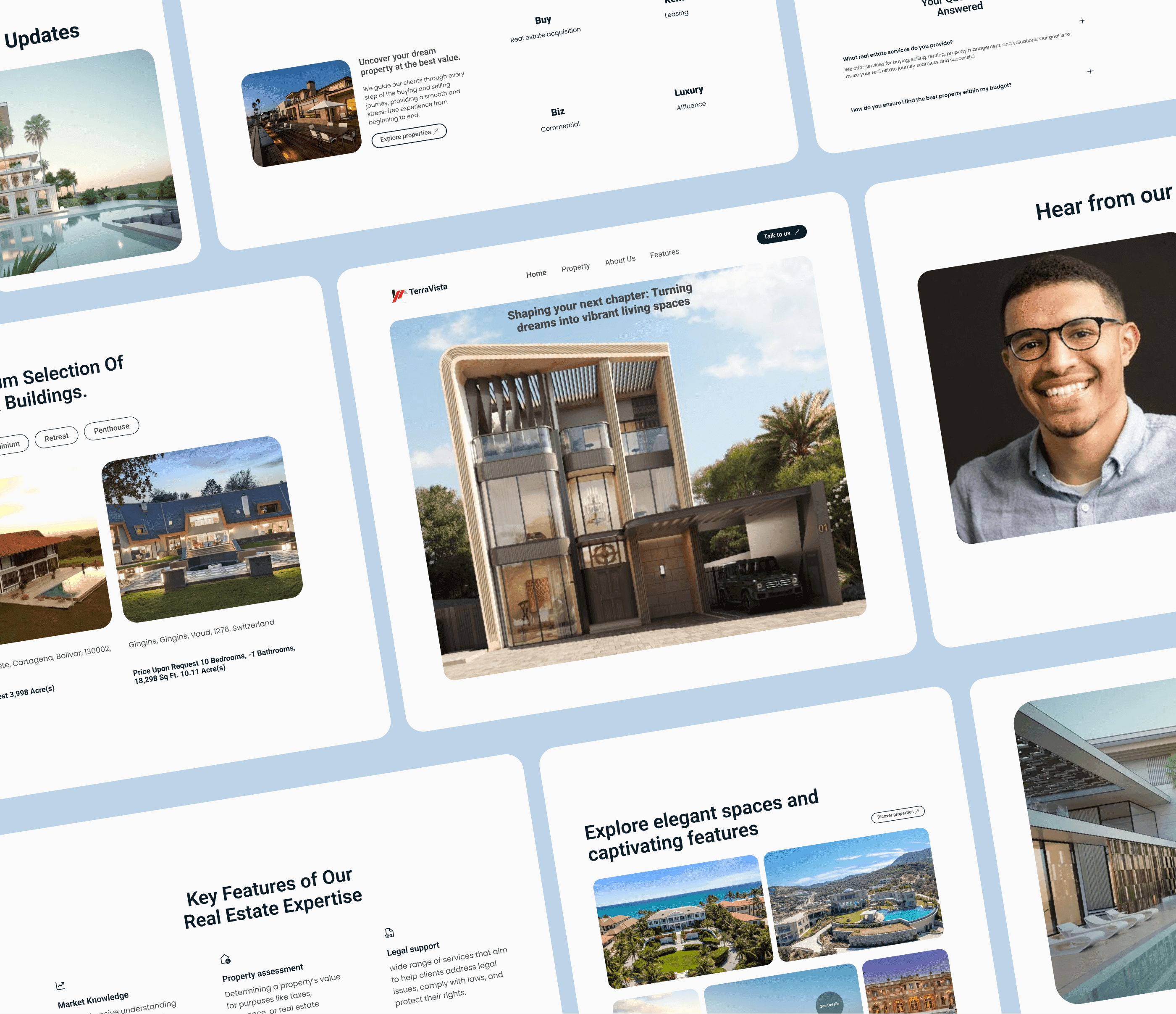 Colour: The overall color scheme for the Terra Vista landing page is clean and minimal, with white as the primary background color to create a fresh, spacious feel. For text, I used #0B1D27 for headings and important information to provide strong contrast and a sense of sophistication. #46494C was used for subtext, offering a softer tone that supports readability without overpowering the layout. This combination ensures clarity, visual hierarchy, and a professional look that aligns with the real estate brand.